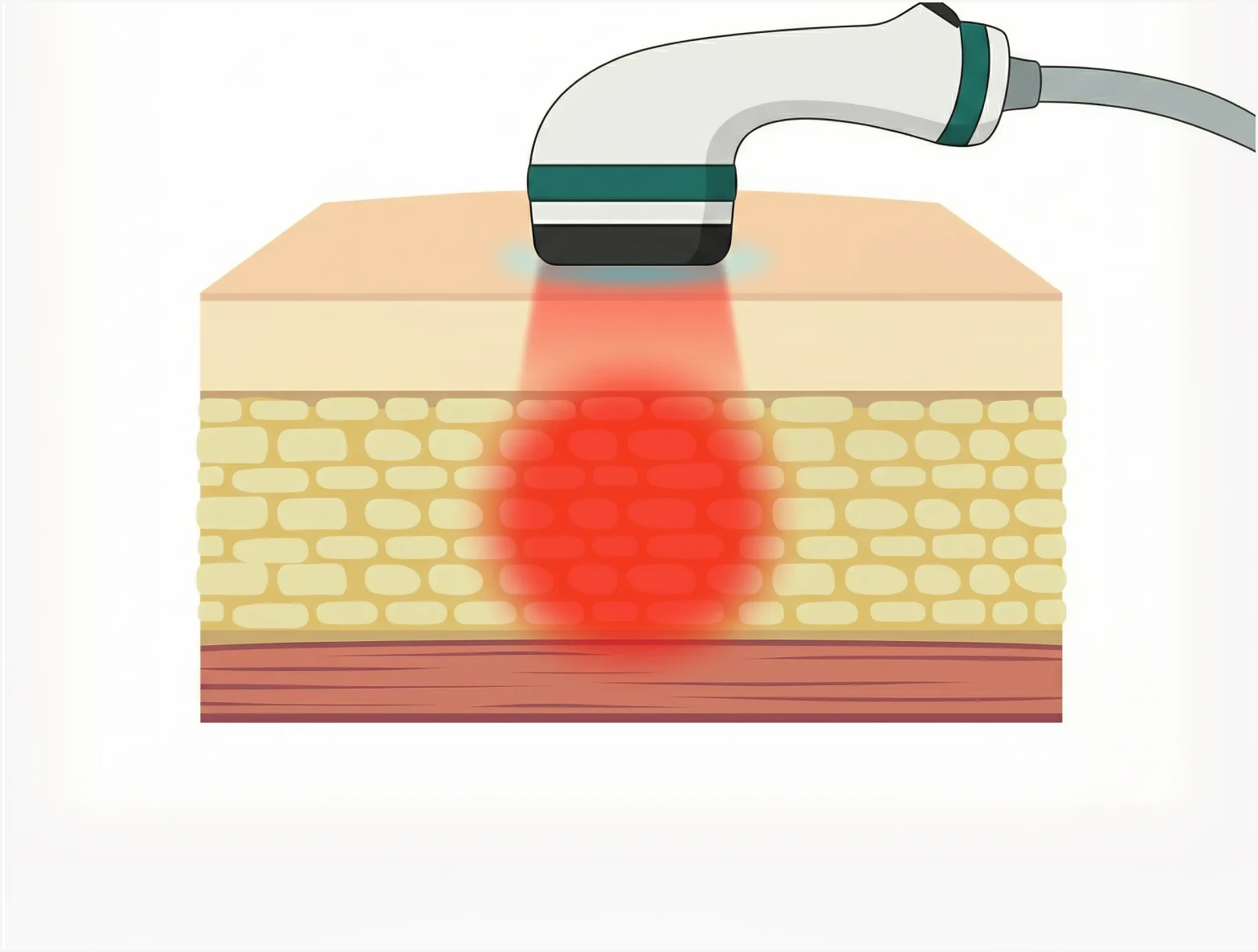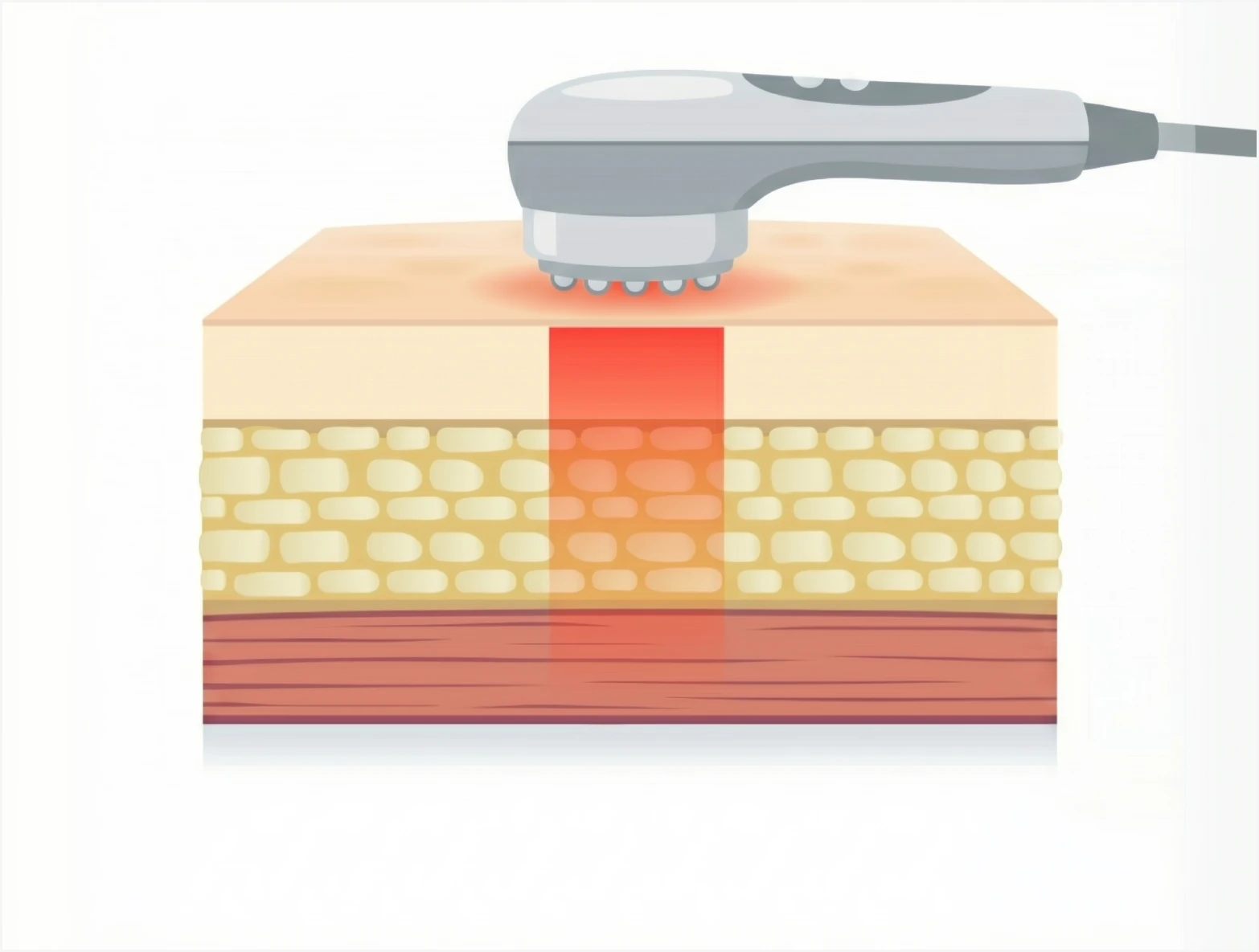表皮でのエネルギー損失がほとんどなく浸透し真皮・脂肪層にのみ選択的に集中 — 表皮を傷つけない安全な施術