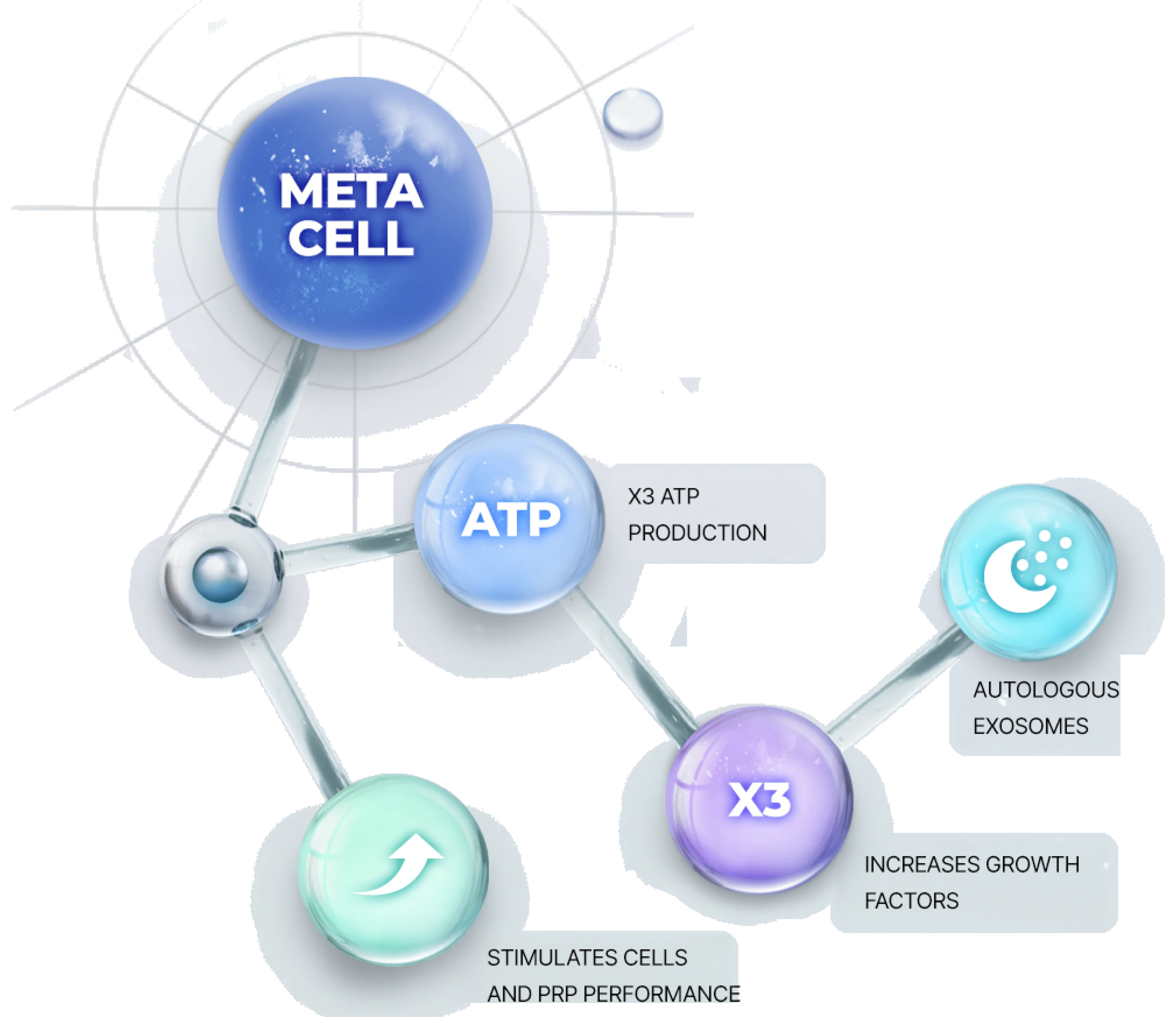 MCTメタセルは従来のPRP施術と比べ、エクソソームと成長因子を最大3倍以上活性化する技術です。PBM(光生体調節)技術により細胞エネルギー(ATP)を増加させ、より強力な再生効果が期待できます。